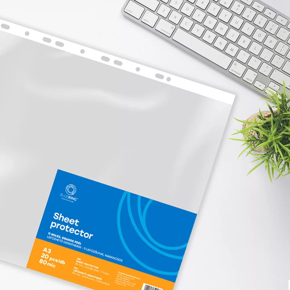 - A3 méretű dokumentumok hosszú távú, lyukasztás nélküli tárolására, - álló formátum, a rövidebbik felső oldalon nyitott -NARANCSOS felület - 11 lefűzőlyuk a hosszabbik oldalon - vastagság: 80 µ - Gyűjtő: 20 csomag/karton Katalóguskód: 8820
