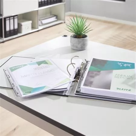 A nagy kapacitású lefűzhető tasakok ideálisak terjedelmesebb dokumentumokhoz és katalógusokhoz otthoni, irodai vagy iskolai környezetben. Kényelmes dokumentumtárolást biztosít, felül és jobb oldalon nyitott, így a tartalma könnyen hozzáférhető. Erős, fém, univerzális, 6 lyukú lefűzőrésszel rendelkezik, amely még a nehéz dokumentumokat is a helyén tartja. Akár 200 A4-es papírlap tárolásához is alkalmas, és kiváló minőségének köszönhetően többször újra felhasználható. A savmentes anyag biztosítja a dokumentumok védelmét, az átlátszó, tükröződésmentes kivitel - a tartalom könnyű olvashatóságát. PVC (polivinil-klorid) műanyagból készül, 48%-ban UL által auditált és tanúsított újrahasznosítottanyag-tartalommal.