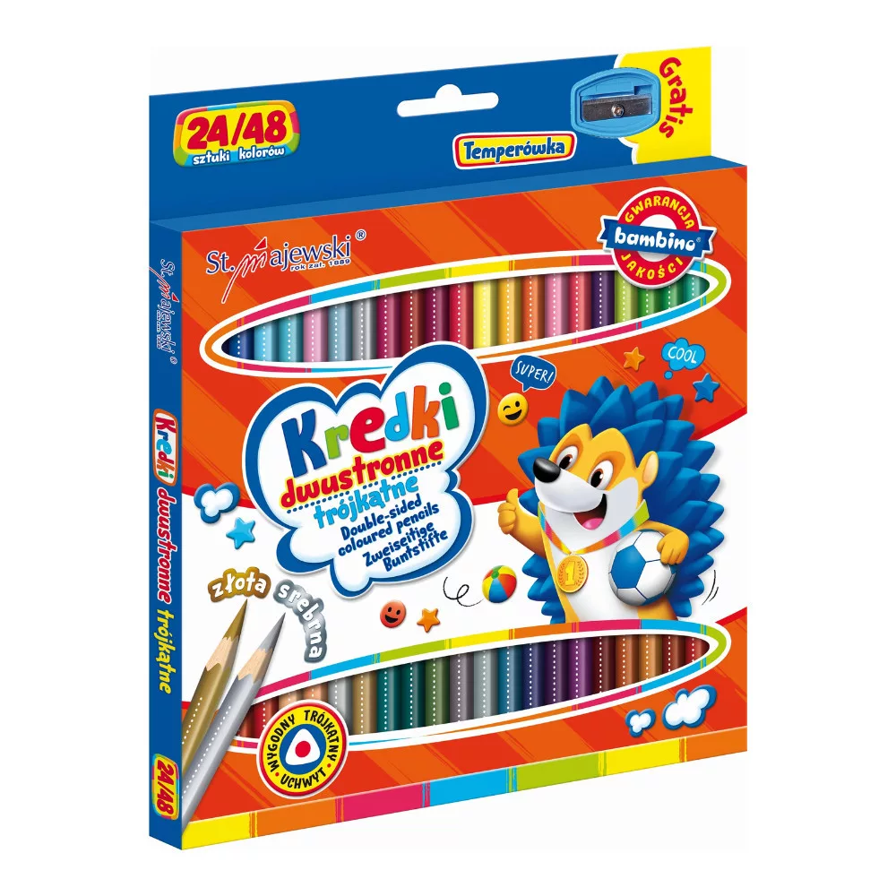 Háromszögletű kétoldalas iskolai színes ceruzák – 24 ceruza, 48 szín, arany és ezüst színekkel, ingyenes hegyezővel.