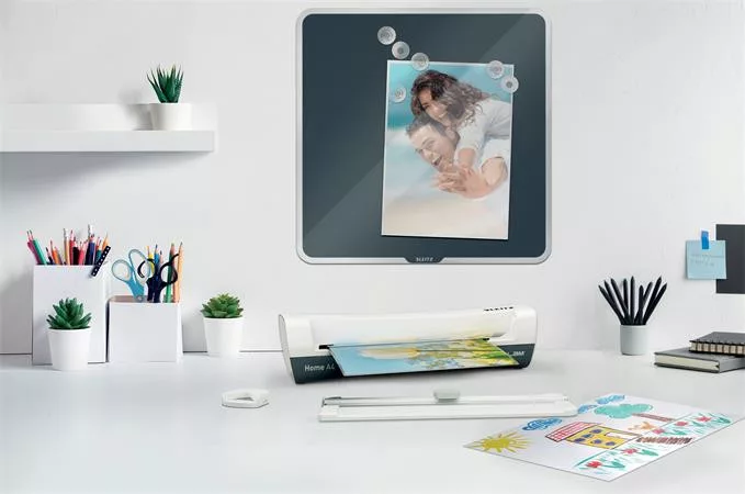 A könnyű és kompakt Leitz iLAM Home A4 laminálógép zökkenőmentesen ötvözi a stílust és a funkcionalitást az otthoni környezetben.