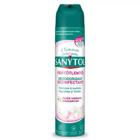 A Sanytol fertőtlenítő légfrissítő aerosol egyedülálló összetételének köszönhetően semlegesíti a kellemetlen szagokat és elpusztítja a felületeken és textíliákon megtelepedett kórokozók 99, 9%-át.