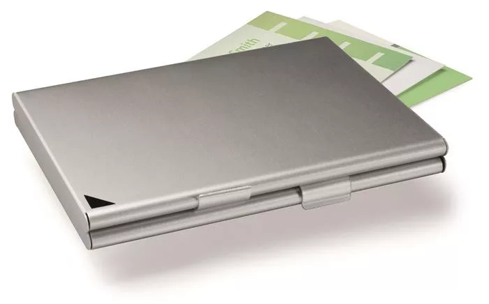 Elegáns, alumínium névjegykártyatartó, matt ezüst felülettel.