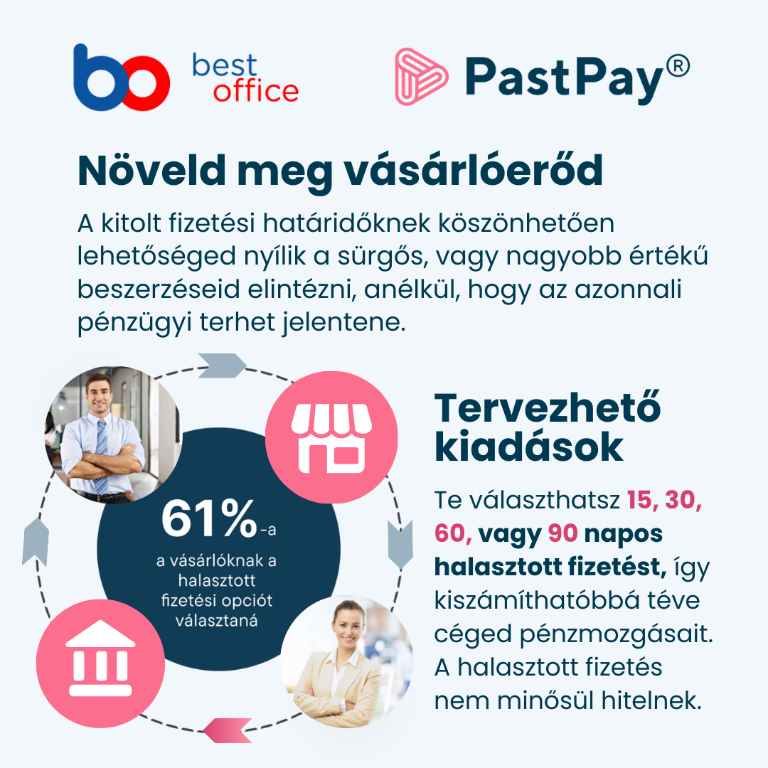 A 15, 30, 60 vagy 90 napos halasztott fizetést a PastPay [Péntech Financial Solutions Zrt.] biztosítja számunkra. Jelen tájékoztató nem minősül ajánlattételnek. A Bestoffice Service Kft. és a Péntech Financial Solutions Zrt. fenntartja magának a jogot a szolgáltatás megszüntetésére vagy a feltételek megváltoztatására.