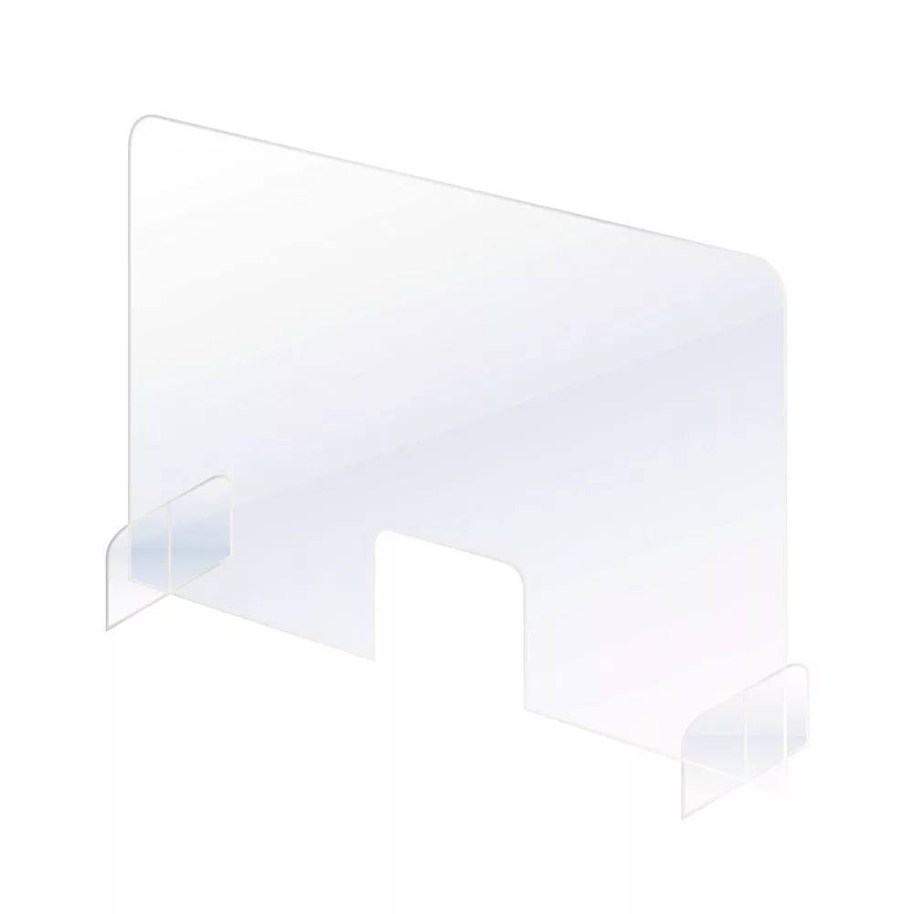 Pult és asztal osztó.  20 x 25 cm kivágás az alján a tárgyak, dokumentumok átadásához. Átlátszó, könnyen tisztítható és fertőtleníthető. Könnyen összeszerelhető ( nincs szükség szerszámokra), hordozható. 24 cm alapmélység biztosítja, hogy a legtöbb pulton használható legyen. Méret : 67 x 84,5 x 24 cm (SzxMxM) - álló. Katalóguskód: 30842