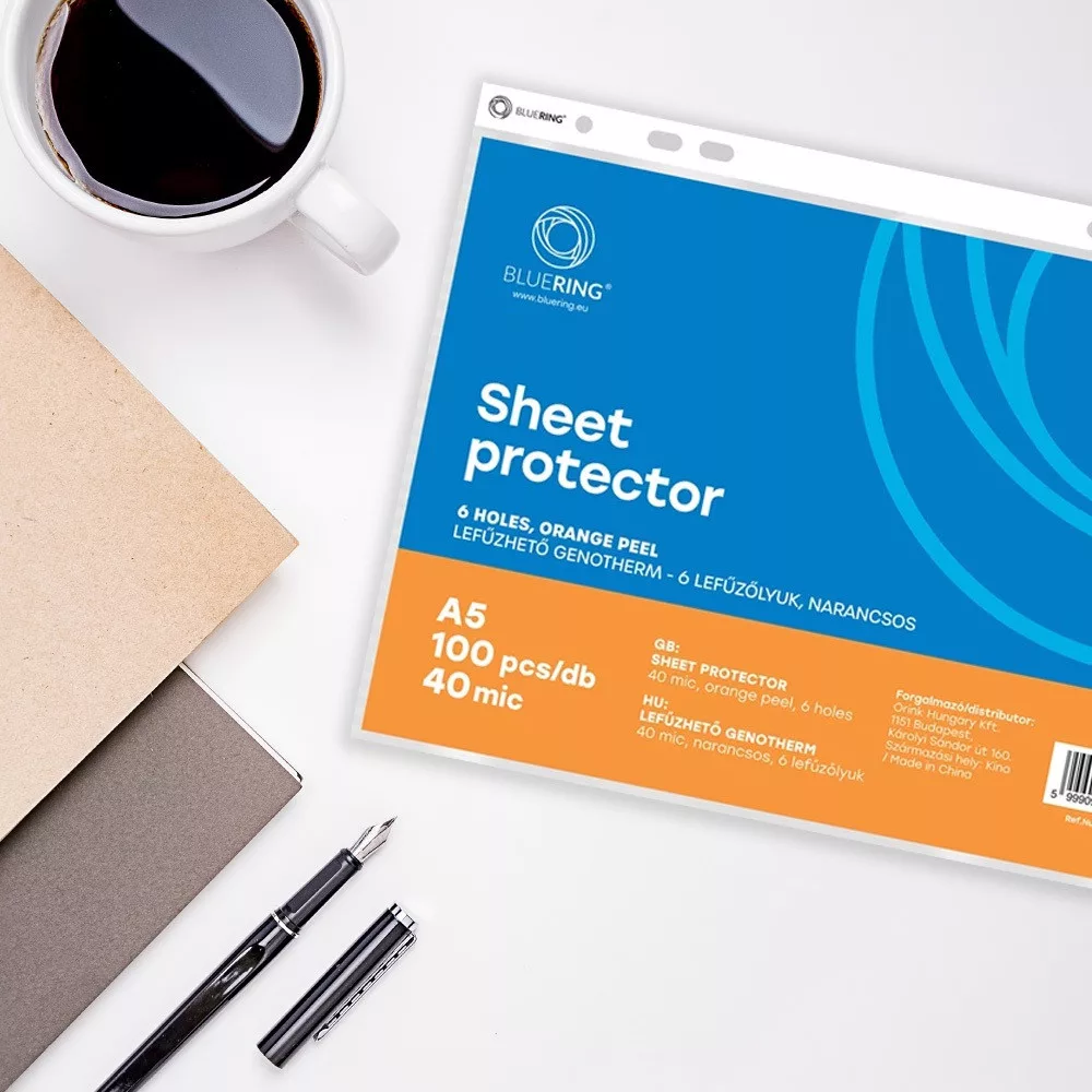 - A5 méretű dokumentumok hosszú távú, lyukasztás nélküli tárolására - felül nyitott - narancsos felület - 6 lefűzőlyuk - az összes, szabványos gyűrűs és emelőkaros iratrendezőbe lefűzhető - vastagság: 40 µ - Gyűjtő: 40 csomag/karton Katalóguskód: 21649
