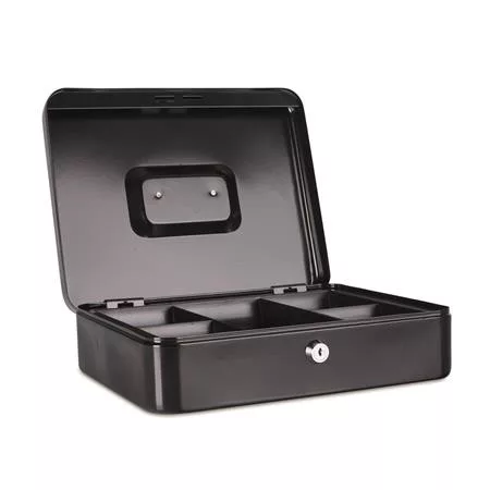 Lakkozott felületű, zárható, fém pénzkazetta -érmetartó tálca -lekerekített sarkok -hordozó fogantyú -2 db kulcs -méret: 300x240x90mm