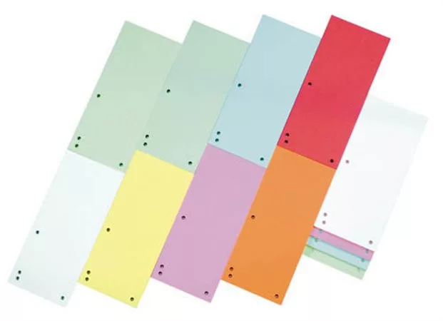 Segítség a rendszerezésben! -színes elválasztócsík, mely 190 g/m2 kartonból készül -lefűzött dokumentumok kategorizálására -az elválasztócsíkon 4 lefűzőlyuk van, így vízszintes vagy függőleges irányban is használható (lyukak távolsága 80 mm) -méret: 235x105 mm -vegyes színek (25x fehér, 25x rózsaszín, 25x kék, 25x zöld)