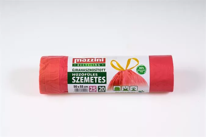 Szemeteszsák, újrahasznosított, húzófüles, 25 l, 20 db, 50x55 cm, 16 µ, MAZZINI, piros