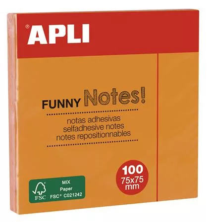 Öntapadó jegyzettömb, 75x75 mm, 100 lap, APLI "Funny", neon narancs